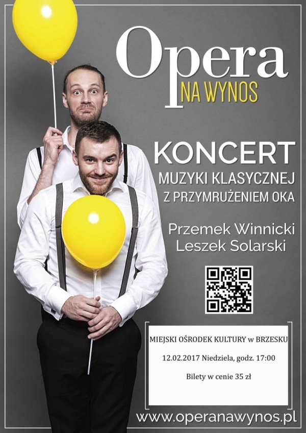 Klasyka muzyczna, ale pozbawiona koturnów oraz spora dawka humoru. To najważniejsze elementy koncertu muzyki poważnej z przymrużeniem oka „Opera na wynos”, który zostanie zaprezentowany 12 lutego o godz. 17:00 w Miejskim Ośrodku Kultury w Brzesku. Natomiast 14 lutego na deskach miejscowej sceny można będzie zobaczyć spektakl, którego współautorem jest laureat Literackiej Nagrody Nobla Dario Fo pt. „Związek otwarty”. Także powinno być rozrywkowo, ponieważ sztuka jest połączeniem farsy z komedią dell’arte.