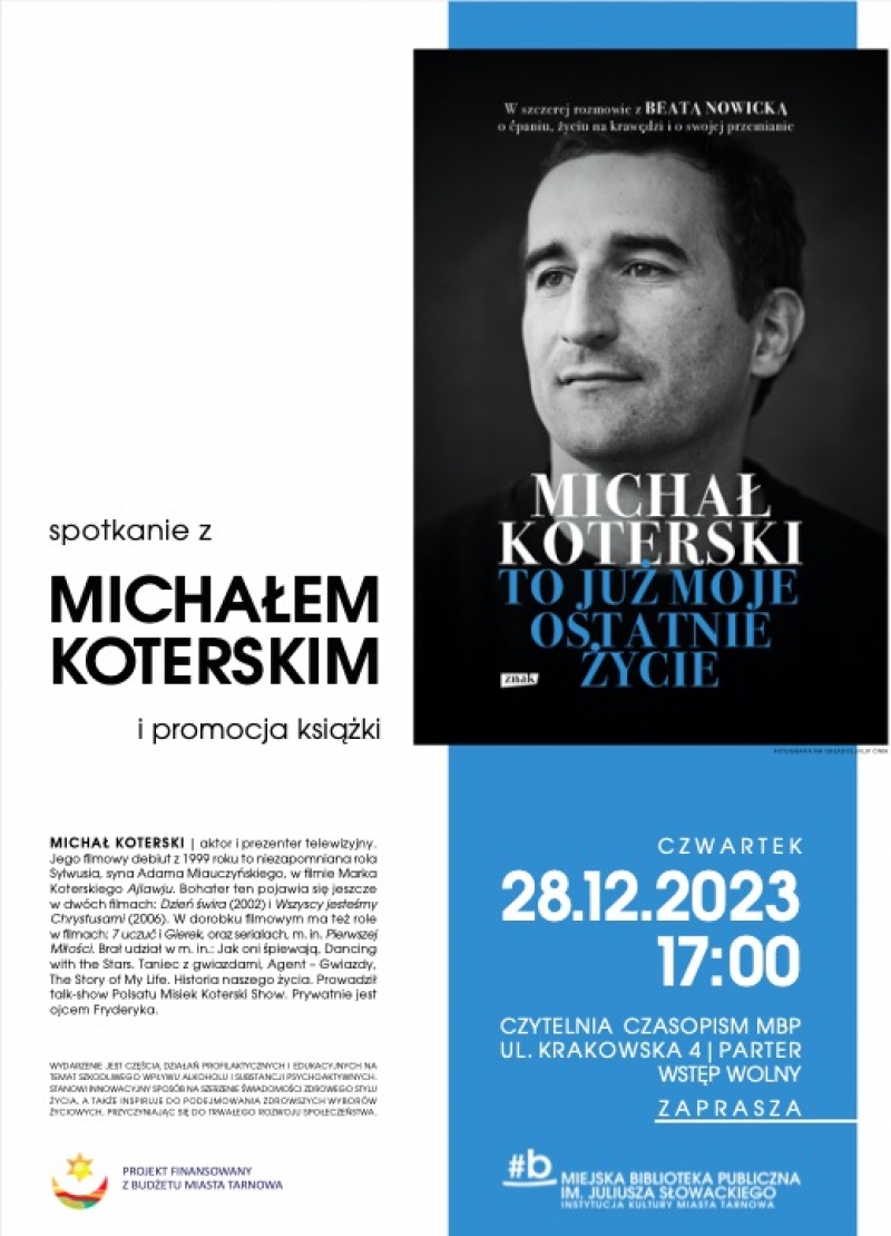 Miejskia Biblioteka Publiczna im. Juliusza Słowackiego w Tarnowie serdecznie zaprasza na spotkanie autorskie z Michałem Koterskim, aktorem i prezenterem telewizyjnym, które odbędzie się w czwartek 28 grudnia o godzinie 17:00 w Czytelni Czasopism MBP, przy ul. Krakowskiej 4, na parterze.