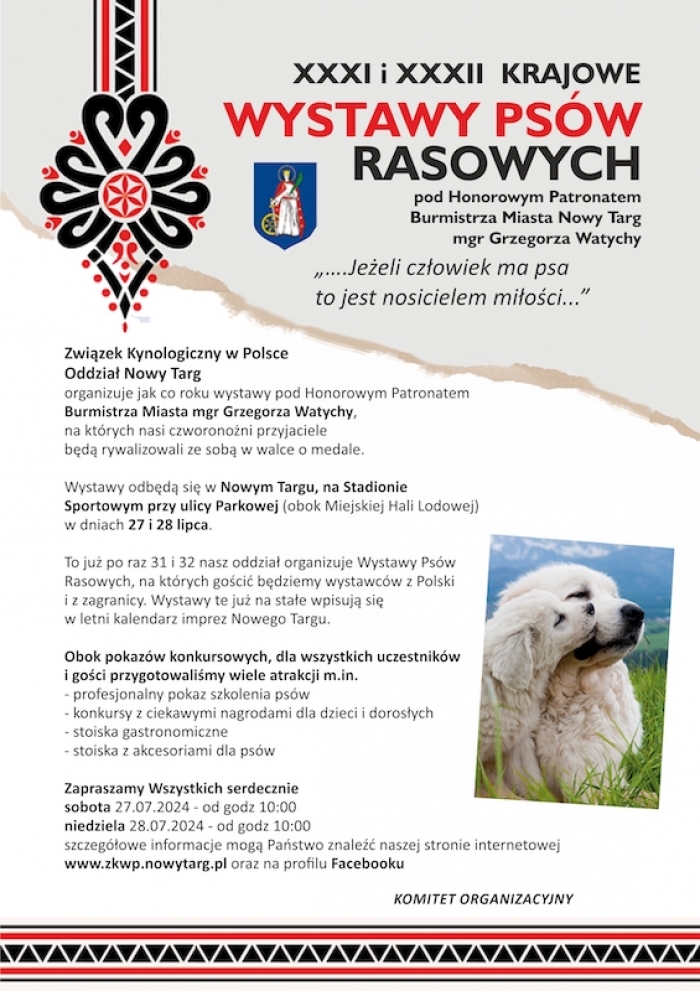 W dniach 27 i 28 lipca w Nowym Targu dobędą się 31 i 32 Wystawy Psów Rasowych pod honorowym patronatem Burmistrza Miasta Nowy Targ Grzegorza Watychy.