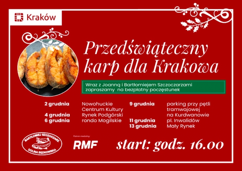 Smażony karp, wegetariańska kapusta z grochem i pieczywo Urząd Miasta wraz z Joanną i Bartłomiejem Szczoczarzami z Gospodarstwa Rybackiego Dolina Będkowska, już po raz piąty zaprasza mieszkańców Krakowa na bezpłatny, przedświąteczny poczęstunek. Pierwsze spotkanie już dziś o godz. 16.00 przy Nowohuckim Centrum Kultury