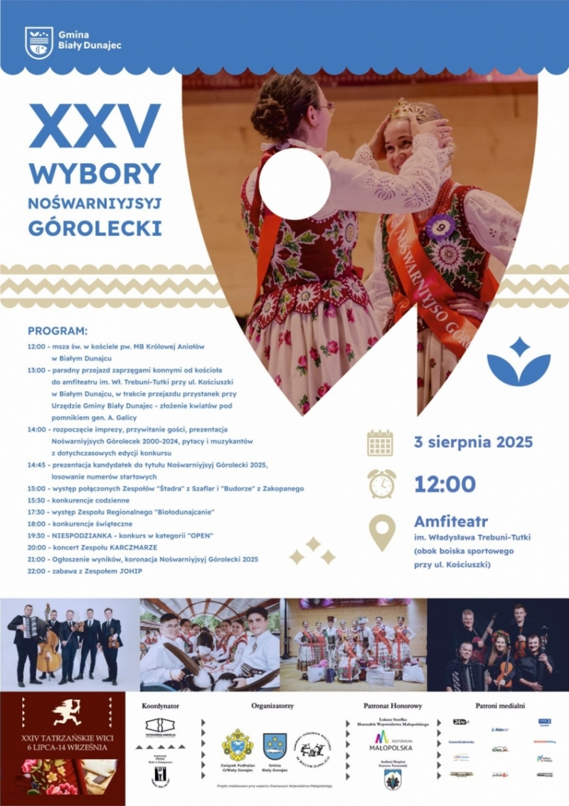W Białym Dunajcu czekają nas wielkie emocje. Wieczorem pozanamy Nośwarniyjsom Górolecke! XXV Wybory Nośwarniyjsyj Górolecki zaplanowane były na 13 lipca, ale to właśnie jedno z wydarzeń, które ze względu na prognozy pogody musiało zostać przełożone na inny termin. Jury wyłoni nie tylko Nośwarniyjsom Góroleckę, ale też Noparadniyjsom, Nosykowniyjsom, Nojlepsom śpiywocke, Nojlepsom tonecnice i Nośwarniyjsom posiadników. Iinternauci natomiast w głosowaniu online na stronie www.noswarniyjso.podhale24.pl wybiorą Nośwarniyjsom Podhale24.pl.