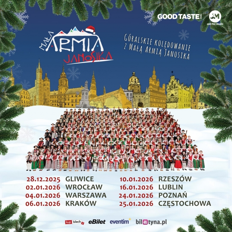Mała Armia Janosika, największa góralska kapela w Polsce, zaprasza na trasę „Góralskie kolędowanie z Małą Armią Janosika” w ośmiu miastach: Gliwicach, Wrocławiu, Warszawie, Krakowie, Rzeszowie, Lublinie, Poznaniu i Częstochowie. Koncert odbędą się w grudniu 2025 i styczniu 2026 roku, a bilety w cenach od 99 zł do 229 zł są już dostępne na stronie: https://www.eventim.pl/noapp/eventseries/3987619/?affiliate=GTP